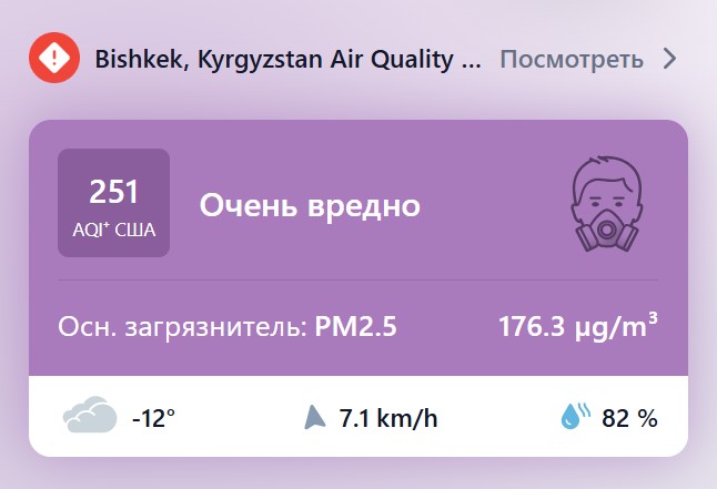 19 января 2026 года Бишкек в очередной раз занял первое место в мировом рейтинге городов с самым загрязнённым воздухом. Индекс качества воздуха (AQI) достиг 396 -это категория «опасно», когда пребывание на улице становится реальной угрозой для здоровья практически всех групп населения. По данным мониторинга, концентрация PM2.5 (самых опасных мелкодисперсных частиц) превысила рекомендованную ВОЗ среднегодовую норму в 48,1 раза. Основной виновник -именно эти частицы PM2.5, которые проникают глубоко в лёгкие, попадают в кровь и способны вызывать серьёзные последствия для всего организма.